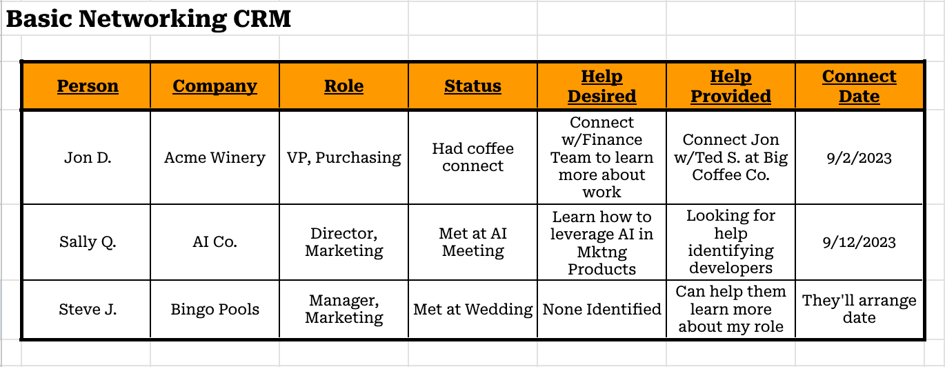 Create a spreadsheet. Start simple. Include basic details (e.g. - name, company, role), help needed / help provided, and status / date connected. Here’s an example: